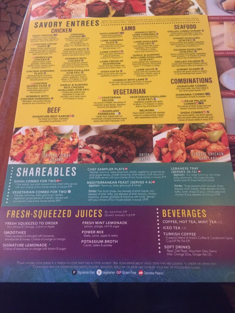 Appetizers: Hummus, Baba Ghanoush & Falafel Entrees: Five lamb chops, two skewers of shish kabob, two skewers of shish kafta, two skewers of Shish Tawook, chicken Shawarma, chicken Ghallaba & Hummus with lamb. Served with 2 Large House Salads